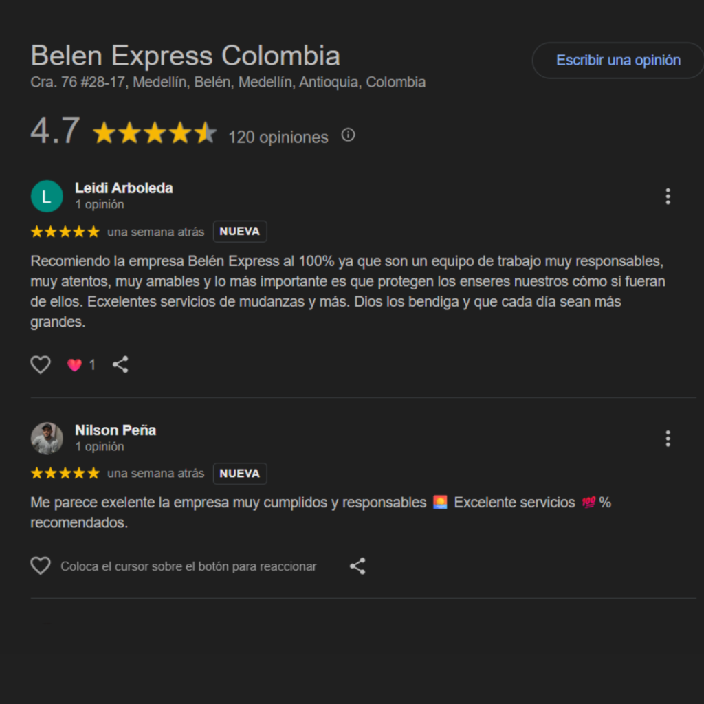 Belén Express es una marca segura porque ofrece condiciones claras, materiales de protección incluidos y un equipo profesional que cumple lo prometido. Sin sorpresas, sin estrés.